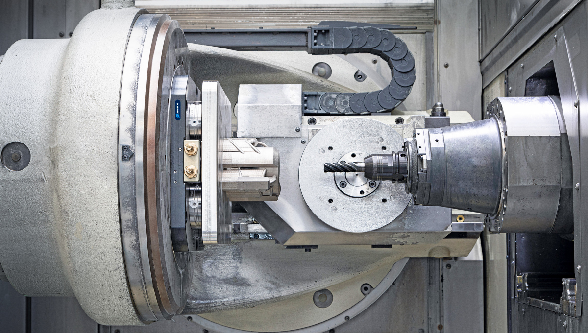 Die Bautei­le­be­ar­bei­tung im Grob-Fräs­zen­trum setzt auf den Werk­zeug­halter TENDO E compact sowie auf die Spann­sta­tion mit Null­punkt­spann­mo­dulen, die das Werk­stück hält – beides von SCHUNK.