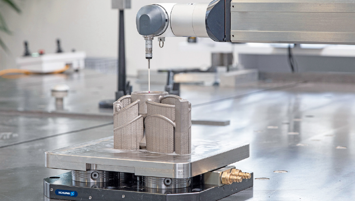Vorau­set­zung für die präzise und effi­zi­ente Herstel­lung solcher Werk­stücke ist die absolut präzise Einspan­nung der Substrat­platte, auf der sich das Produkt im Maschi­nen­raum additiv aufbaut. Hier besticht das VERO‑S NSE-HT mini 88–20, das SCHUNK eigens für Anwen­dungen im 3D-Metall­druck konzi­piert und ausge­legt hat.