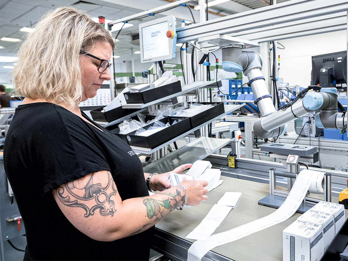 Abschließend legt der EGP 40 das Bauteil in einer zweiten Aufnahme ab, aus der es die Mitarbeiterin zur Verpackung wieder entnimmt. Während der automatischen Laserzellenbeladung kann die Mitarbeiterin andere Arbeiten ausführen. Sie bereitet Versandschachteln vor, reinigt fertig montierte Teile mit einem Tuch, legt sie in die Kartons, fügt ein neues Netzteil zusammen und legt es dem Roboter in einer der beiden Werkstückaufnahmen vor.
