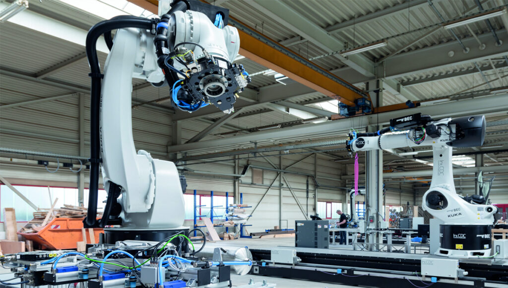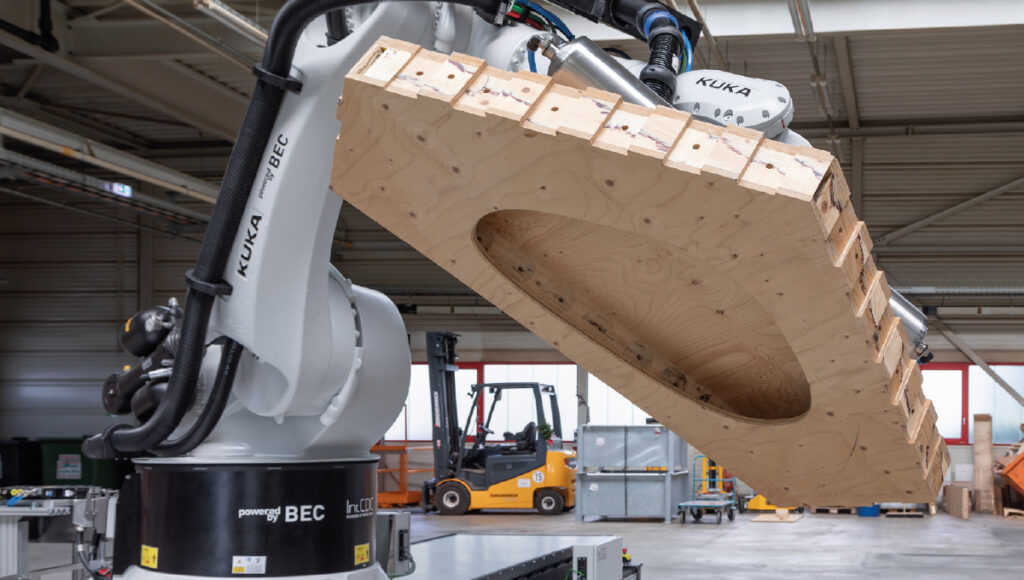 Gemeinsam mit dem Systemintegrator BEC entstand jüngst eine mobile, roboterbasierte Produktionsplattform, die Bauteile aus Holz bedarfsgerecht handhabt, bearbeitet und montiert. „Wir dürfen die Ideen, die die Wissenschaft hat, in konkrete Anlagen umsetzen“, erklärt BEC-Geschäftsführer Matthias Buck. „Hierzu bedienen wir uns geeigneter technischer Komponenten und Module, die alle Anforderungen in alle Richtungen erfüllen – sie müssen zuverlässig, flexibel und zukunftsfähig sein.“