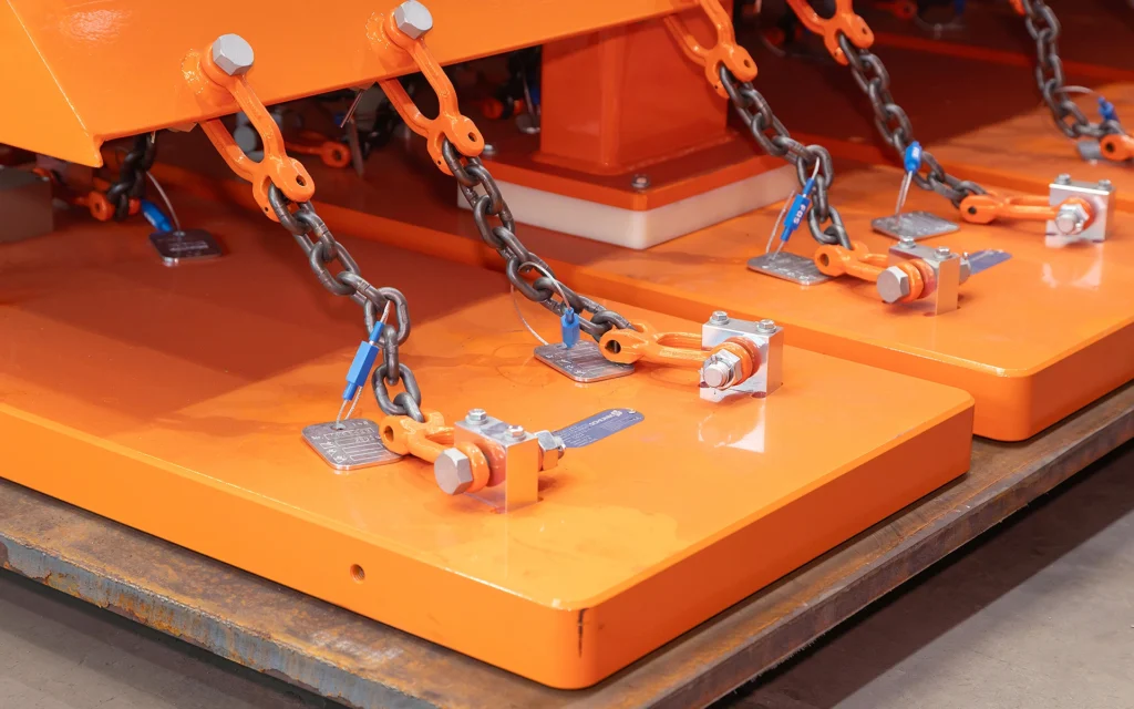 Controlling the load lifter by radio remote control ensures a safe distance from the operator and helps to prevent accidents. Demagnetization is only possible when the load has been removed and the chain sling has been relieved. This is monitored by two redundant safety lifting eye switches arranged diagonally at the chain sling attachment points; they prevent the load from falling during the lifting phase due to unintentional actuation or incorrect operation. This ensures comprehensive safety in the event of a power failure or overvoltage. Any incorrect operation on the cross beam or via radio remote control is also ruled out.